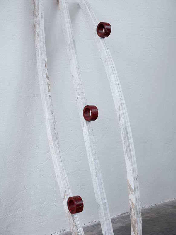 Inspired on the one hand by the minimalist sculpture of artists such as John Mccracken, Carl Andre or Dan Flavin, and on the other hand to the curved and enveloping forms of Brazilian architecture, the three sculptures represent different instants of the same movement, the still life of an unstable balance where every static moment becomes dynamic.